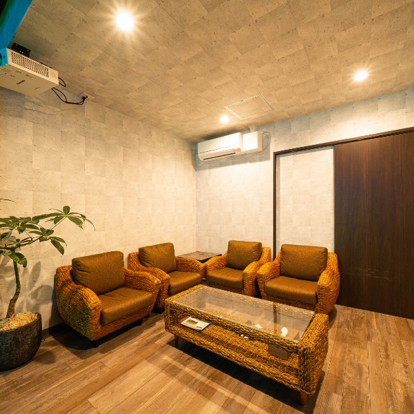 フロントはアジアン家具に合うように白を基調に施工しました。壁にかかるモニターではみんなでスポーツ観戦もできます。