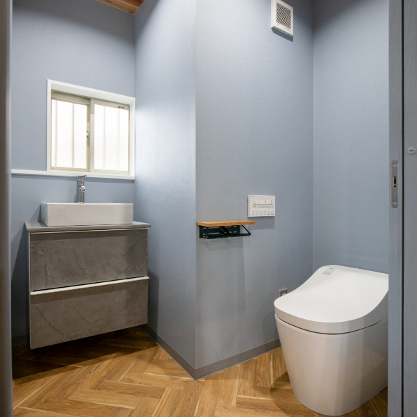 四角の置き型の手洗いボウルはスッキリとして、洗面台のグレーによく映え、清潔感があります。