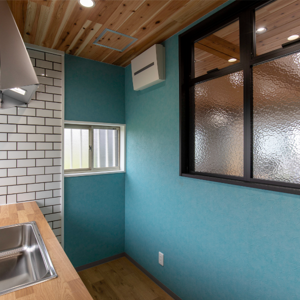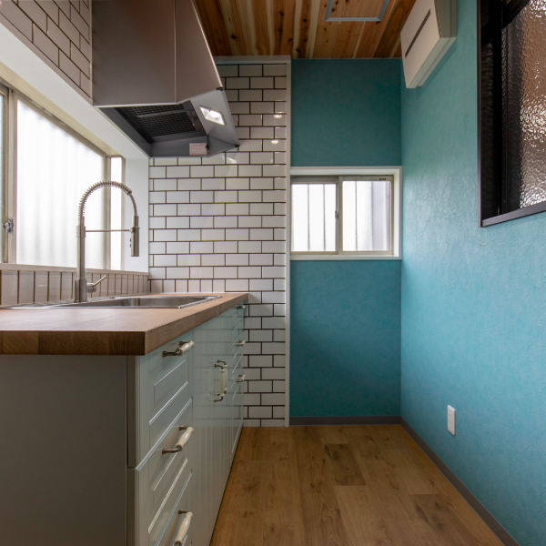 タイルの壁と明るいティファニーブルーの壁紙が映えます。