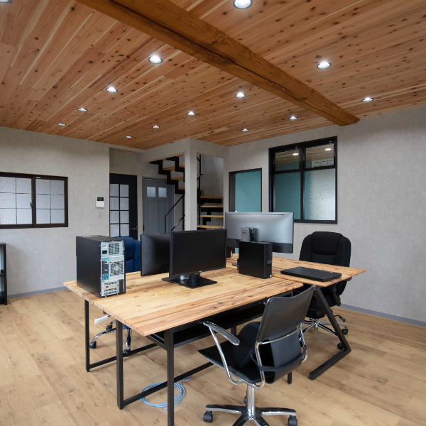 ネイビーの建物の縦ラインにレッドシダーを入れたことで見た目がスタイリッシュで、高級な外観になりました。 事務所なので、閉鎖的な空間になりがちですが、チェッカーガラスや、鉄骨の階段を入れることで、 プライバシーを守るところと、空間が抜けて広く感じるように工夫しています。