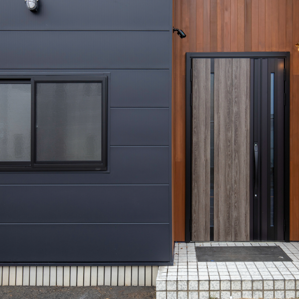 ネイビーのサイディングにレッドシダーが映える外観にしました。 近年ここ数年人気のあるデザインです。
